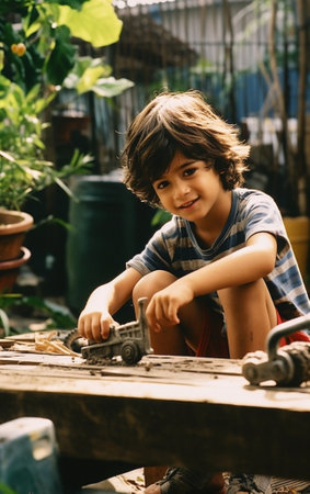 Generative AI : Smiling little boy learning to cut wooden plank with saw with help of father while spending time together in joinery workshop