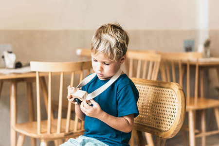 Cute adorable toddler boy sitting on the sofa in the living room and playing with vintage photo camera. Child taking picture with old camera. Future photographer. Kid with retro camera.
