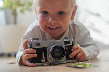little boy with blonde hair laugh with retro camera.