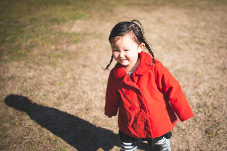 Toddler girl playing on the winter lawn