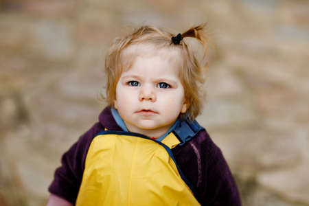 Cute adorable toddler girl playing outdoors on spring day. Baby child wearing yellow mud rain puddle pants trousers. Portrait of happy girl.
