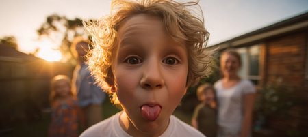 A child humorously photobombs a family portrait with crossed eyes and tongue out, set in a suburban backyard during the golden hour. The playful moment captures family fun.