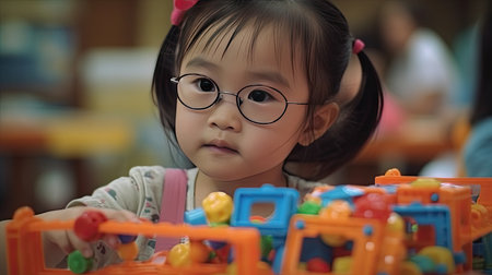 A young children playing with colorful plastic blocks on a table, AI