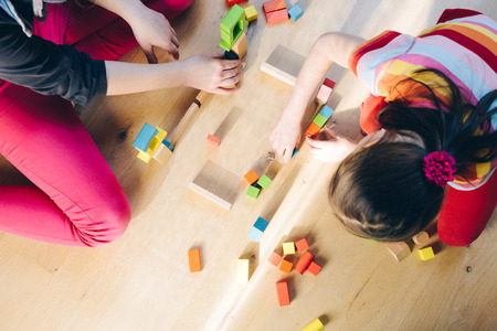 children playing with colorful wooden blocks - view from above