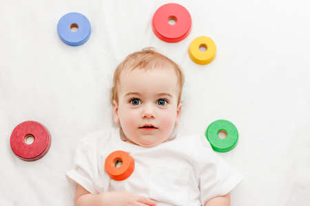 baby boy lie with pyramid wooden rings toy top view on white background