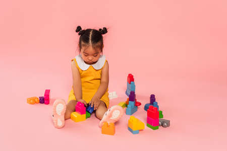 asian toddler girl in dress playing colorful building blocks on pink
