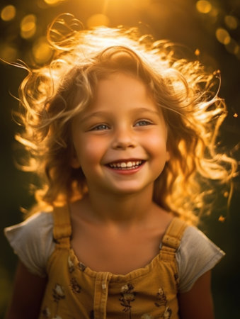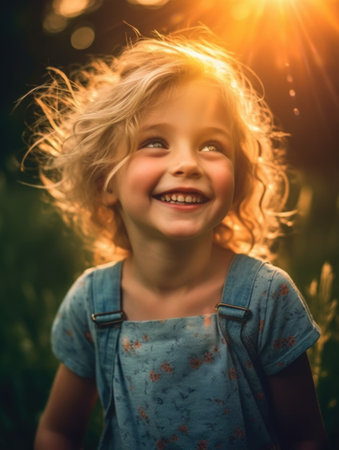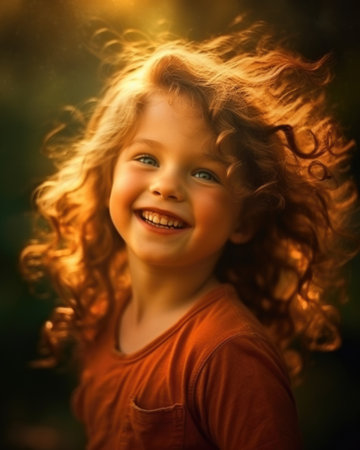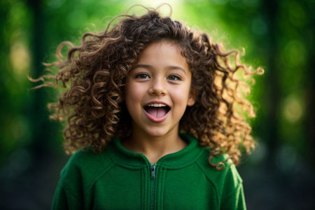 Enchanting Surprise: Curly Haired Little Girl's Open-Mouthed Portrait in a Green Park