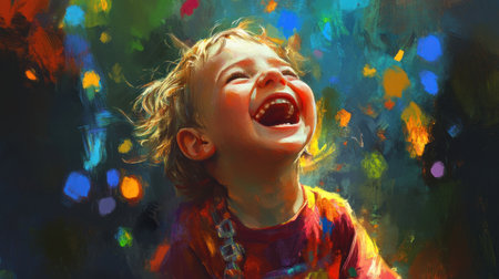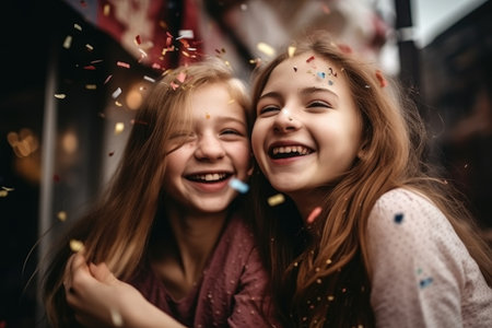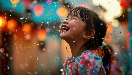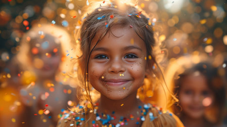 A young girl laughing heartily surrounded by colorful confetti and cheerful children at a party. A.I.