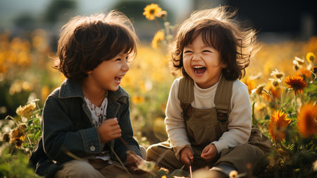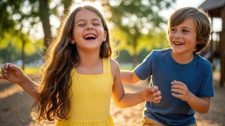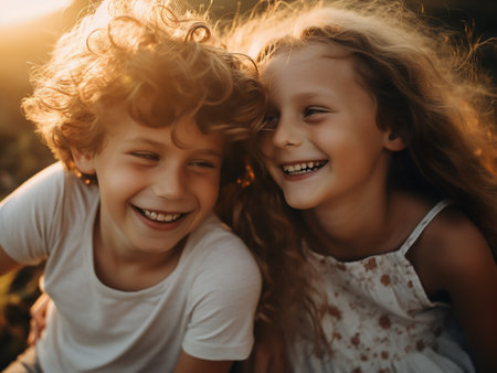 Two children are captured in a moment of pure joy, laughing heartily in an outdoor setting. The image showcases warm sunlight and a blurred background, creating a cheerful atmosphere. The composition and lighting are suitable for a variety of uses, including marketing, editorial content, and educational materials.