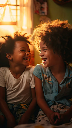 Two joyful African-American children, with smiles, share a moment of laughter in a cozy bedroom.
