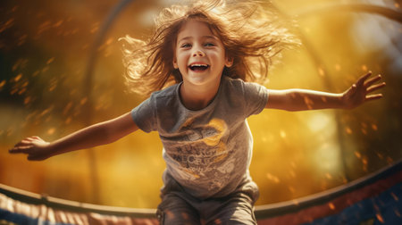 A joyful child swings high, laughing joyfully as her hair flies through the air.