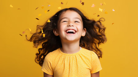 Portrait of a laughing little girl with flying confetti isolated over yellow background