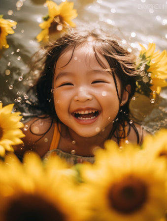 Generative AI : beauty happy laughing girl with splashes of water and yellow flowers