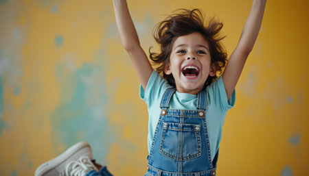 A cheerful young boy with curly hair is jumping with excitement against a vibrant yellow wall. His infectious smile and playful energy radiate pure joy, capturing the essence of childhood happiness.