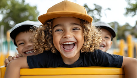 Joyful group of diverse children smiling and laughing outdoors on a bright sunny day, showcasing happiness, friendship, and fun.