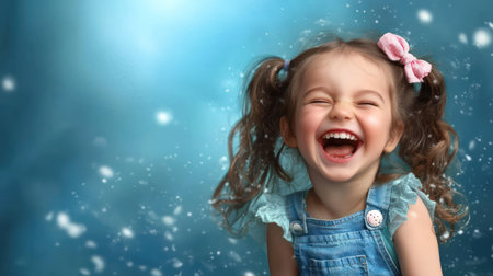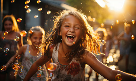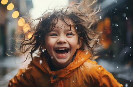 Generative AI : happy funny child girl in a spray of water droplets laughs