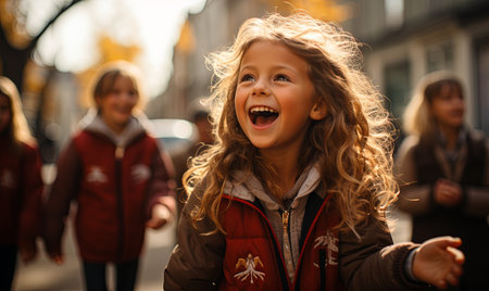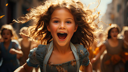 An AI generated illustration of a cheerful young girl laughing in the street surrounded by children