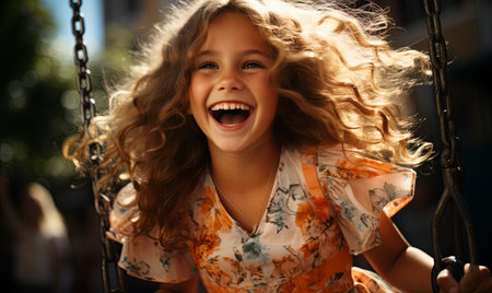 Close up smiling face, young indian girl playing on a swing, happiness, childhood, freedom, vitality, outdoor fun, carefree, sunlight. Generative AI AIG20.
