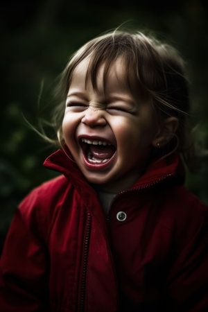 An AI generated illustration of a happy laughing young toddler in a red jacket