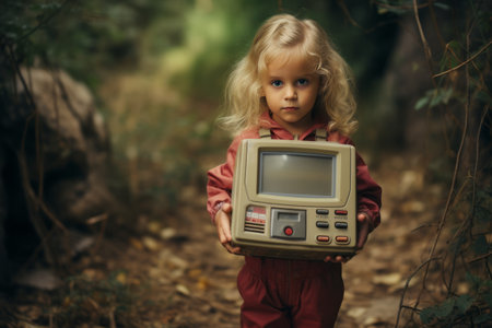 A young child holds a colorful vintage robot toy close to their face, with bright blue eyes expressing curiosity. Sunlight brightens a cozy indoor space filled with warmth.