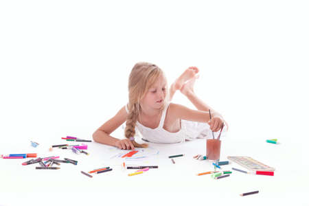 young girl painting with watercolor on floor of studio against white background