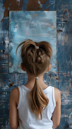 A young girl with a thoughtful expression paints on a canvas, immersed in the colorful chaos of her creation.