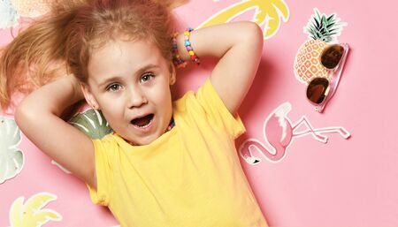 Little happy girl lying on the floor in a yellow T-shirt and sunglasses happy smile with paper palms and flamingos and pineapple on a pink background. The concept of summer holidays, relaxing at the resort