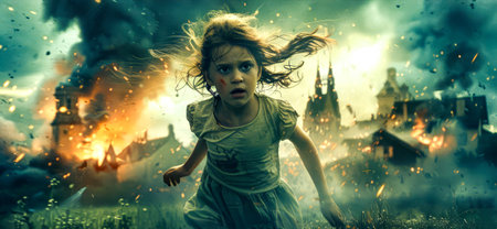 A girl with tousled hair expresses shock and awe in a dramatic environment with smoke and movement.