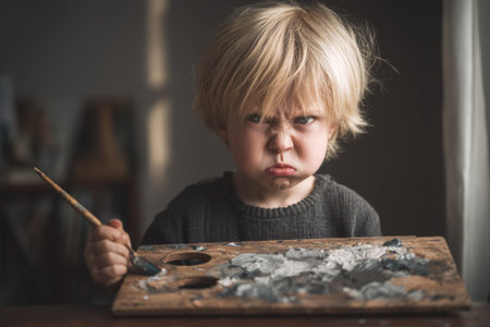 Little boy with an angry expression holding a paintbrush and a wooden palette with mixed colors, expressing frustration or boredom while painting
