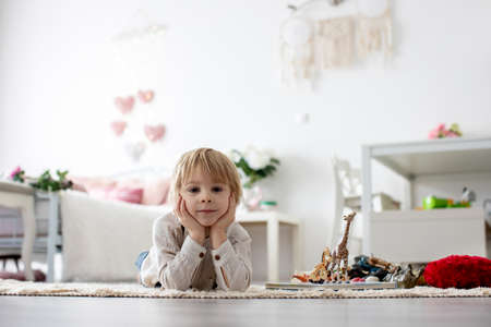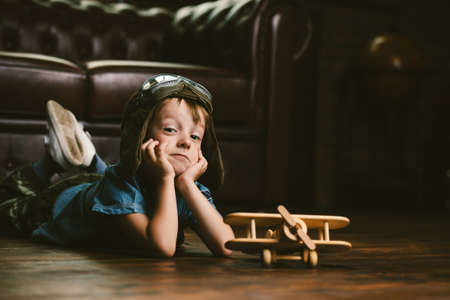 Cute dreamer boy playing with toy airplane at home. Childhood. Fantasy, imagination.