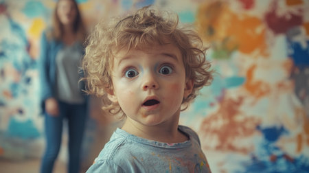 A curly-haired toddler with a surprised expression, paint smudges on their face, and a colorful abstract wall in the background.