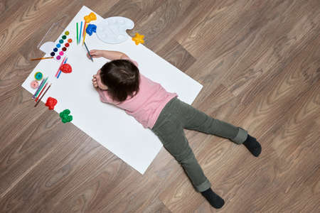 A little girl, lying on a wooden floor on a white piece of paper. Next to it are colored pencils and paints. She's going to paint. Copy space.