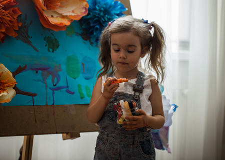 the little girl in the painting process at the easel