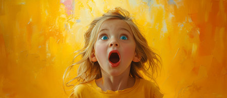 Vibrant portrait of a young girl with open mouth against bold orange background in expressive painting