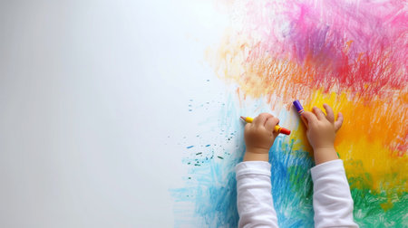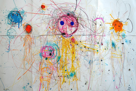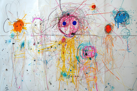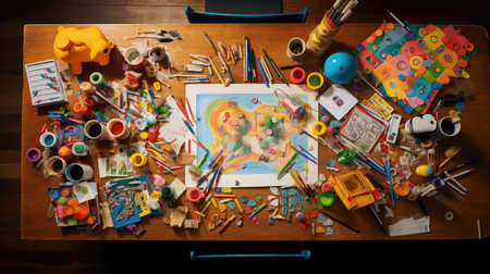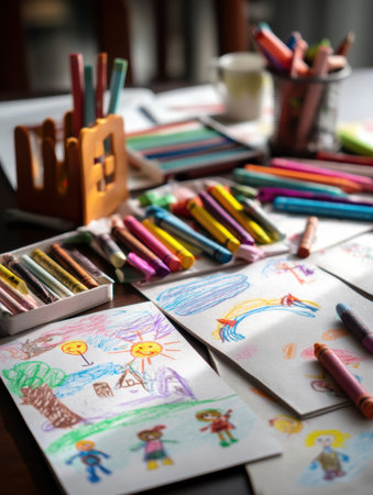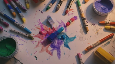 An engaging scene filled with colorful crayons, paints, and scattered drawings, showcasing a vibrant artistic workspace perfect for inspiring creativity and imaginative play.