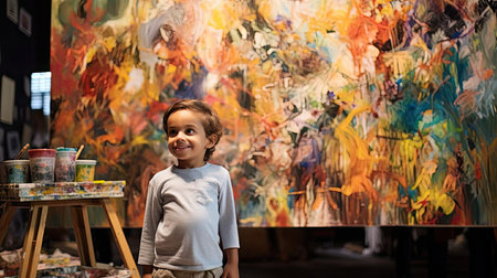 A young boy stands captivated in front of a vibrant and intricate painting, his eyes wide with wonder as he takes in the array of colors and shapes before him.
