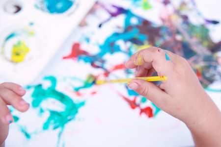 A brush put on the color palette. A child paint with colorful watercolor on the white painting paper.