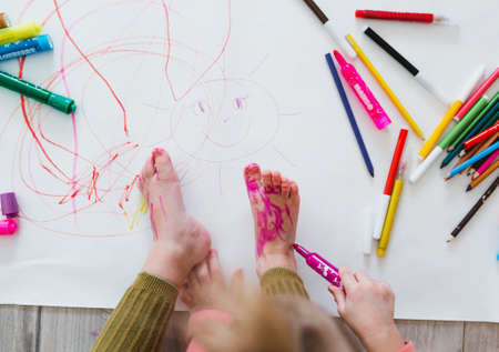 A little girl, sitting on the floor, enjoys creativity, drawing pictures with pencils on paper. top view