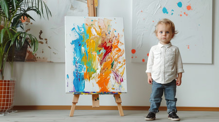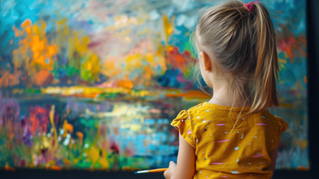 A young girl with a thoughtful expression paints on a canvas, immersed in the colorful chaos of her creation.