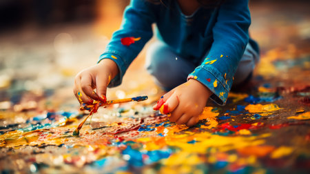 A close-up photo of a cute little boy deeply engrossed in painting. His hands are covered in vibrant colors, and his expression shows pure concentration and joy.