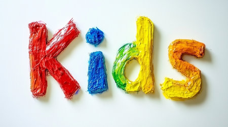 Kids written with colorful impasto paint on white background, ideal for children related concepts