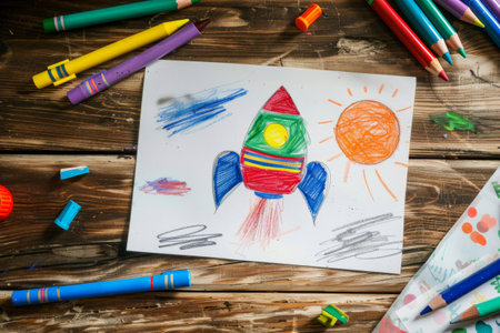 Colorful child drawing of rocket flying toward the sun, surrounded by markers and pencils on a wooden table. Concept of childhood creativity and imagination