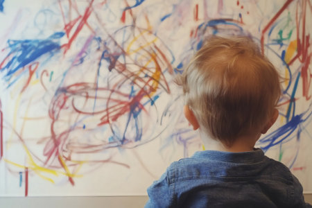Toddler's back showing, admiring a wall covered in colorful, abstract drawings, representing childhood creativity and playful mess