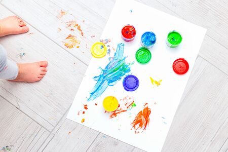 Baby feet and finger paints multi-colored. Flat lay