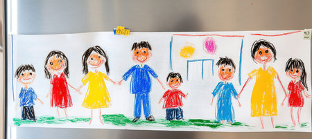 Colorful crayon drawing of two families holding hands in front of school, attached to refrigerator door with magnet