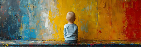 A young child wearing a blue shirt stands with their back to the viewer, gazing at a wall filled with vibrant, colorful scribbles. This image captures the essence of creative exploration and the joy of childhood.