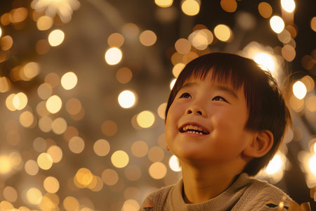 Smiling young boy with sparkling bokeh lights creating a warm, festive atmosphere