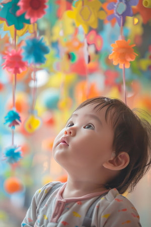 An infant's look of awe, eyes wide and mouth slightly open, as they gaze at a colorful mobile spinning above, enchanted by the movement and colors.