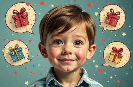 A young boy with a happy smile stands against a colorful background decorated with illustrations of wrapped gifts. His expression radiates excitement and anticipation, creating a festive atmosphere..