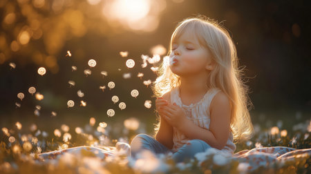 A little girl sits on a blanket in a sunlit field, blowing gently on dandelions. Seeds float away like dreams, capturing a magical moment of innocence and joy during a warm afternoon.